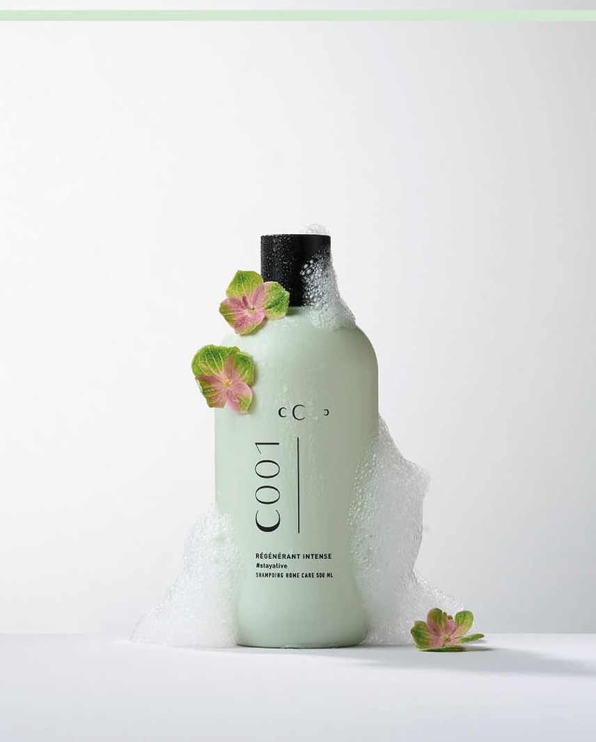 MODE D’EMPLOI: Appliquer une petite quantité de shampoing Régénérant Intense C001 sur cheveux mouillés, massez puis rincez abondamment.